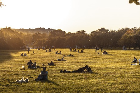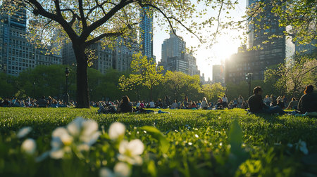 People relaxing in a vibrant city park during sunny afternoon in spring