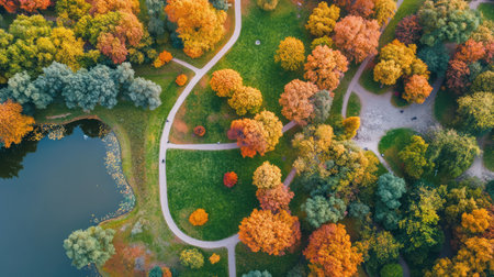 Aerial view of a vibrant autumn park with winding pathways and colorful trees near a tranquil pond