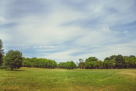 Calm and serene garden with ample copyspace, colorful skies and vegetation. Property outdoors conceptual image for reflection and relaxation.