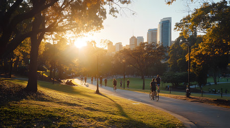 A vibrant urban park scene at sunset, featuring people biking and walking amidst greenery and city skyscrapers.