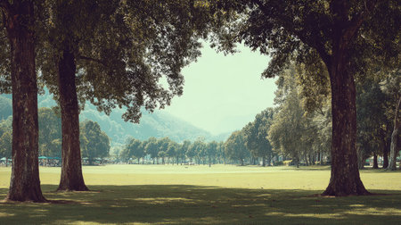 A breathtaking landscape captures the essence of tranquility in nature, featuring lush green grass, majestic trees, and distant mountains under a clear sky.