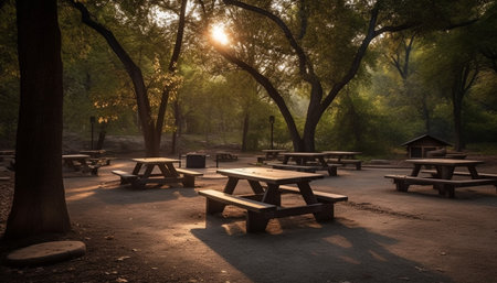 A tranquil autumn sunset, sitting on an old wooden bench generated by artificial intelligence
