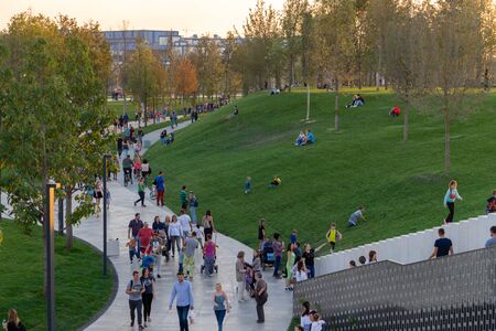 Krasnodar, Russia-October 8, 2017: Modern Galitsky Park at sunset. People walk among the trees.