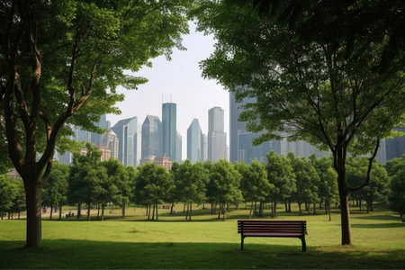 park, with view of a bustling city skyline, providing respite and escape from the busyness of daily life, created with generative ai
