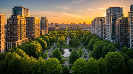 An aerial perspective showcases a vibrant urban park with dense green trees and a reflective pond nestled among...