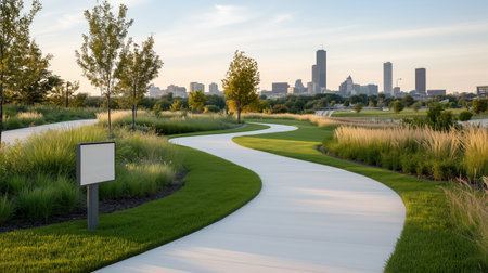 Scenic park pathway with city skyline in distance. Urban green space
