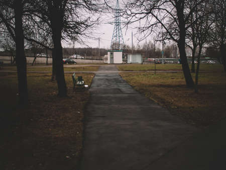 Morning in the city park with a bench and high-rise buildings