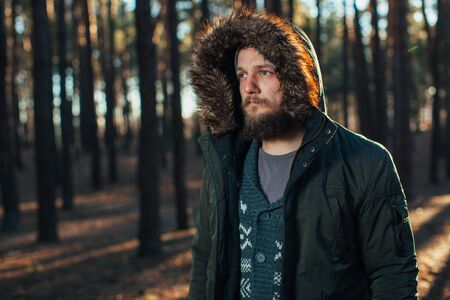 Portrait, close-up of young stylishly serious man with a beard dressed in rgreen winter jacket with a hood and fur on his head stands against the background of pine forest
