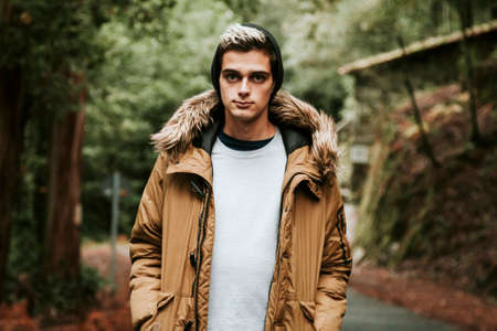 Portrait close-up of young stylishly man with a beard dressed in winter jacket with a hood