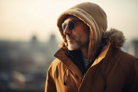A man in a hooded jacket standing on the street. AI