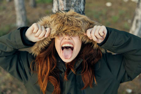 A woman in an autumn jacket shows her tongue near a tree in the forest