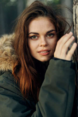 woman in a jacket with a hood near a tree attractive look close-ups nature