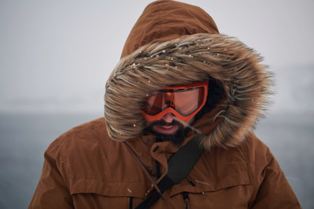 Head shot of a man in a cold snowy area wearing a thick brown winter jacket, snow goggles and gloves on a cold Scandinavian night. Life in the cold regions of the country.