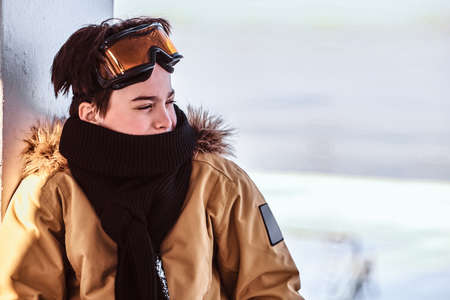 Portrait of a teenage snowboarder dressed in snowsuit and protective goggles sitting on railing near the snowy beach