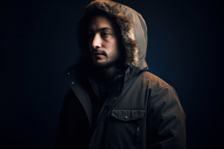 Handsome young man in winter coat with hood on dark background