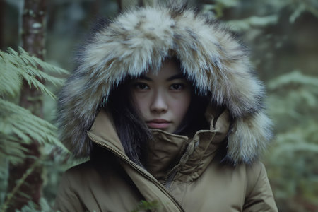 Fashionable woman posing in a forest while wearing a cozy parka with a fur hood, gazing confidently at the camera amidst the trees