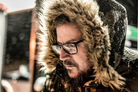 man at winter in stormy weather wearing warm fur jacket