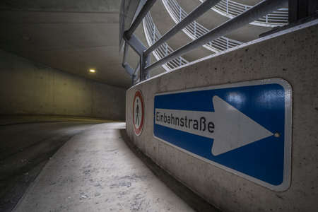 Empty cement Parking Garage interior and exit sign Arrow sign in parking garage interior Industrial building or Supermarket.
