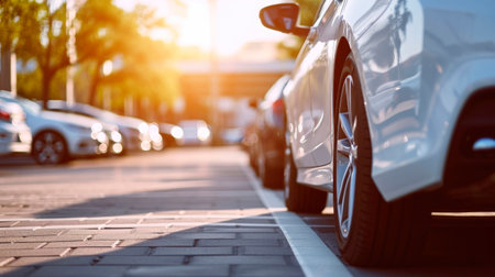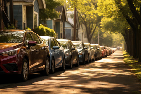 An image showcases parked cars lining a street with buildings visible in the background. The scene is illuminated by sunlight filtering through trees, creating shadows and highlights. The composition suggests an urban or suburban environment. It's suitable for various commercial uses, including website design or editorial content.
