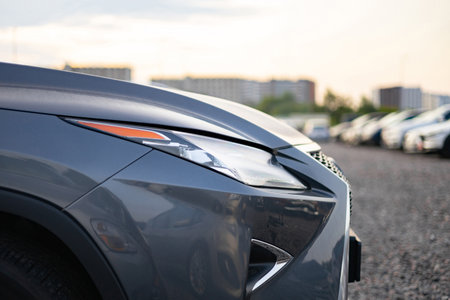 Car parking lot row in modern condominium close up on front lamp transport industry