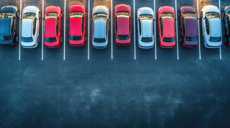 A bird's eye view showcases sedans in red and blue hues arranged precisely within the parking spaces of a dark blue parking lot, emphasizing order.