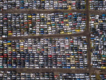 Top down aerial view of an abandoned car graveyard filled with old, damaged and unused vehicles arranged in dense rows. Concept of decay, waste, recycling and forgotten transport