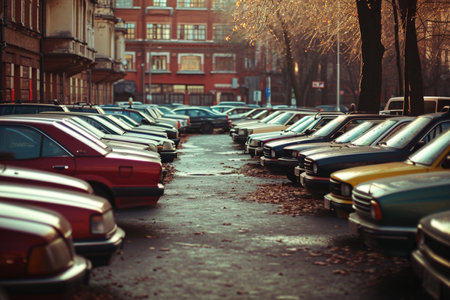 A bustling urban street featuring a row of parked cars with soft morning light creating a warm atmosphere through surrounding trees.