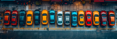 Aerial view of colorful vehicles in a large parking lot with diverse arrangement