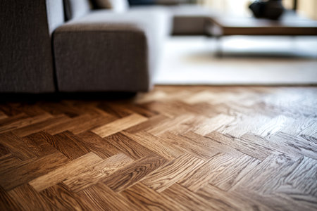 A detailed shot of parquet flooring in an elegant living room, showing different shades of natural wood and seamless pattern transitions.