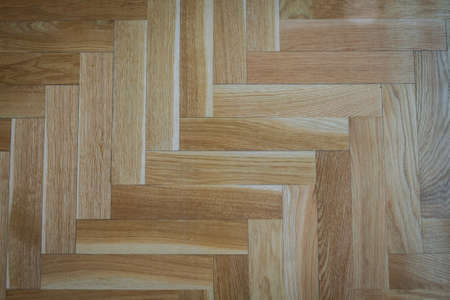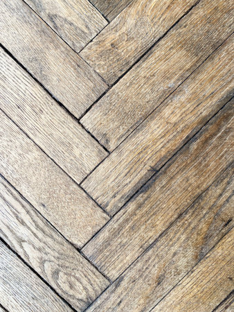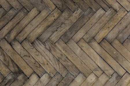 Old tiled wooden floor - parquet. Aged and cracked, very dry and discoloured. Worn lacquer from parquet.