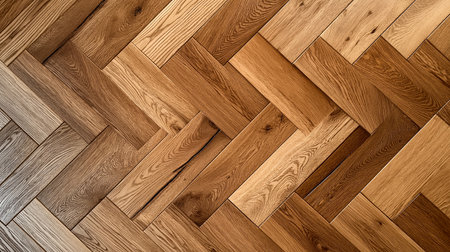 Top view of a herringbone wooden floor pattern in rich brown tones, offering a classic and elegant aesthetic