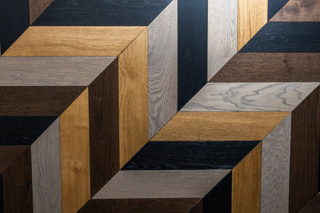 Patterned wooden floor background with interlocking dark and light wood tiles, creating a geometric design.