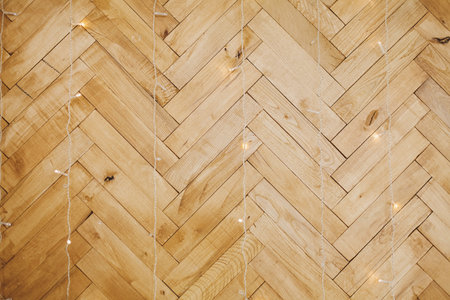 Herringbone patterned wooden flooring features light brown planks with visible grain and texture, creating a warm and inviting indoor atmosphere