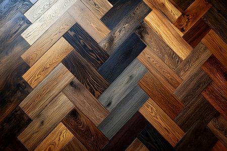 A seamless herringbone pattern composed of various wooden textures, showcasing a range of rich colors and grains. ideal for interior design inspiration, flooring solutions, or architectural elements. Generative AI