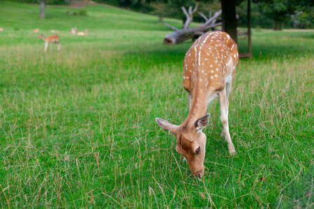Deer lies on grass cute little, outdoors.