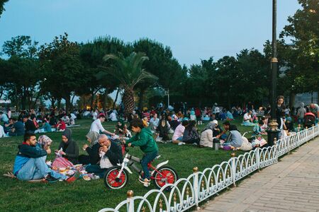 Istanbul, June 16, 2017: Many people of the Islamic religion take food on the Sultanahmet square next to the blue mosque along with their relatives at the time allowed in the Ramadan fast. Ramazan.
