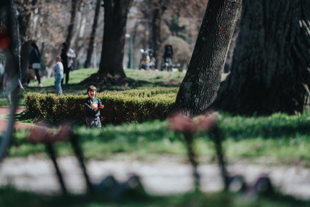 Joyful child playing in a peaceful park surrounded by trees and greenery on a sunny day