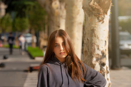 Beautiful teen girl on the street of European city. Travel.