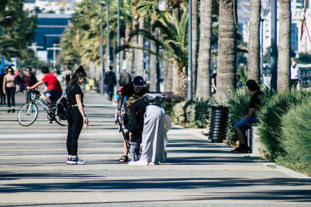 Limassol Cyprus May 05, 2020 View of unidentified people walking in the streets of Limassol in the afternoon during the coronavirus outbreak