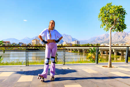 Happy woman with long blonde braids hair on the roller-skate in the park beach and mountain background