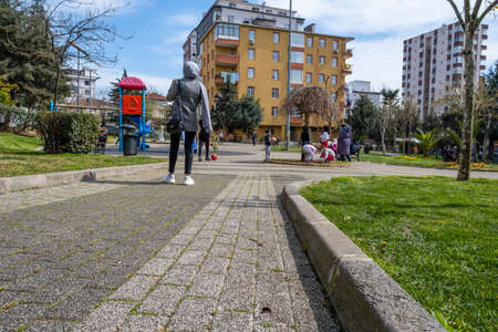 Maltepe, Istanbul, Turkey - 04.13.2021: some Turkish people with protective masks having fun in a public park in a clear air in Spring