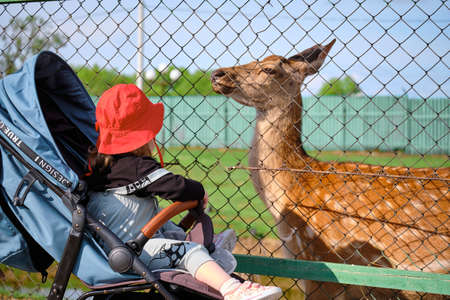 A little girl in a baby carriage feeds a deer at a zoo in Khabarovsk, Russia.