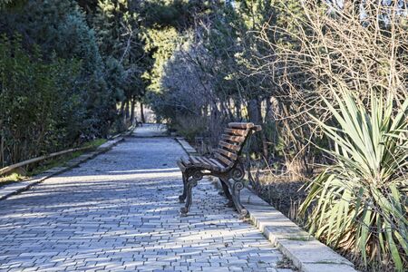 Empty wooden bench in the city park. Baku Azerbaijan