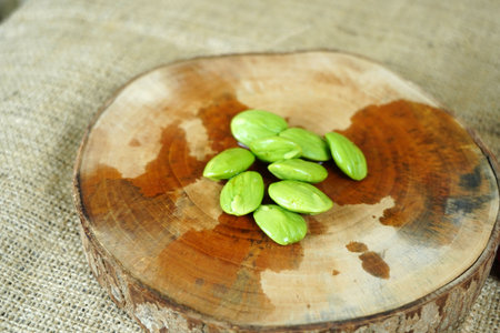 Bitter Beans on wood table. With copy space for text or design.