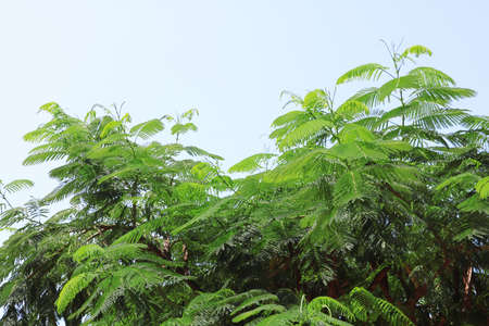 Green leaves against a blue sky. Acacia in summer.