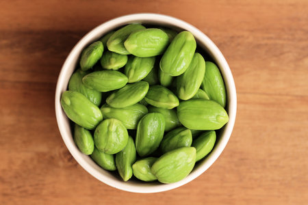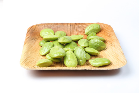 Sato seeds, Bitter bean in the Wooden bowl isolated on white background, Thai vegetable food