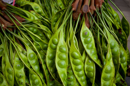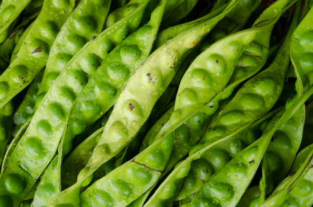 Petai fruits or vegetables, a common name in Indonesia for Parkia speciosa. Natural background.