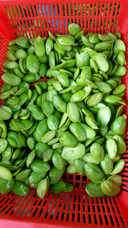 Raw of petai or pete (Parkia speciosa). Usually eaten raw and cooked, popular with name stink bean or bitter bean. Pete plants grow a lot in Indonesia. Indonesia use petai for fresh vegetable, dishes.