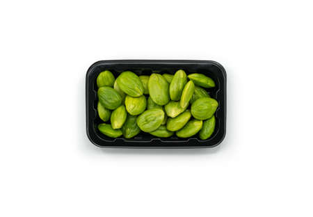 Top view fresh bitter beans in a plastic black tray for sale on white background, bitter beans or Sator in Thailand language.