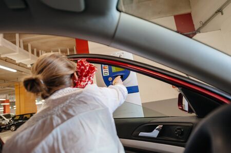 Paris, France - Jul 14, 2011: Woman paying at the vending car parking barrier gate - view from inside the car Visa, Mastercard and Maestro icon on the device